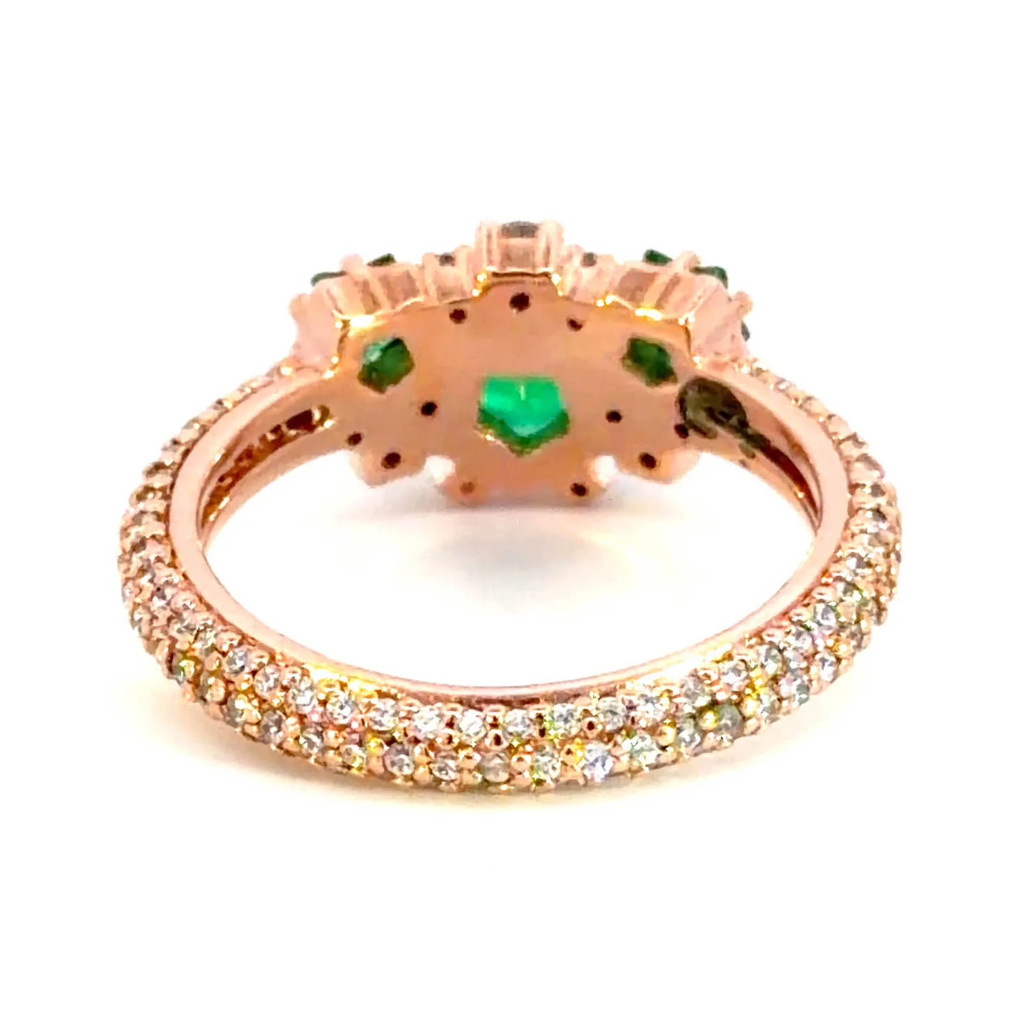 Adorn your finger with this exquisite rose gold multistone ring, showcasing vibrant green, star-shaped emeralds. The emeralds feature a mixed cut, enhancing their brilliance and clarity. A testament to refined craftsmanship, this ring seamlessly blends sophistication and distinctive design.