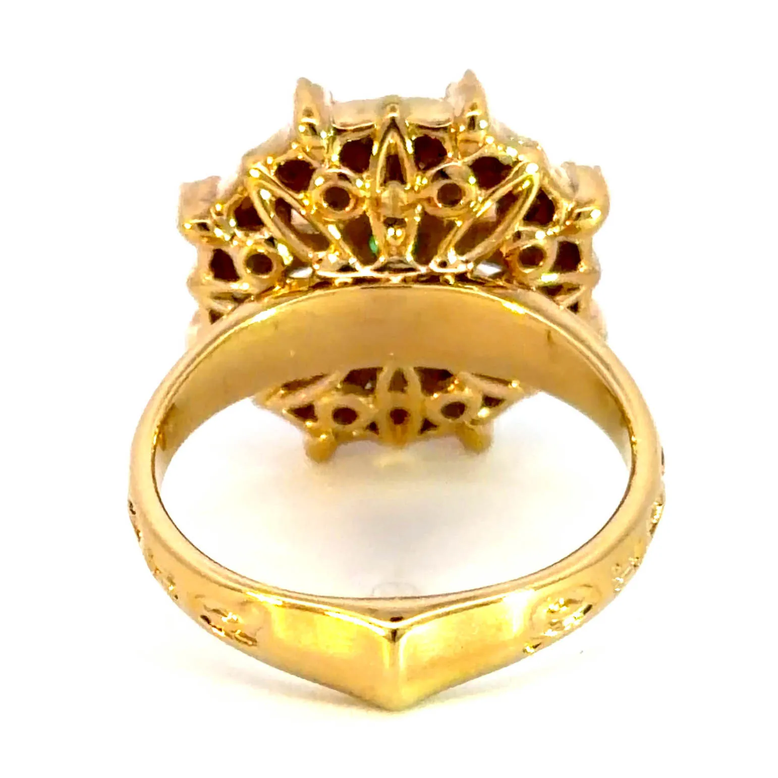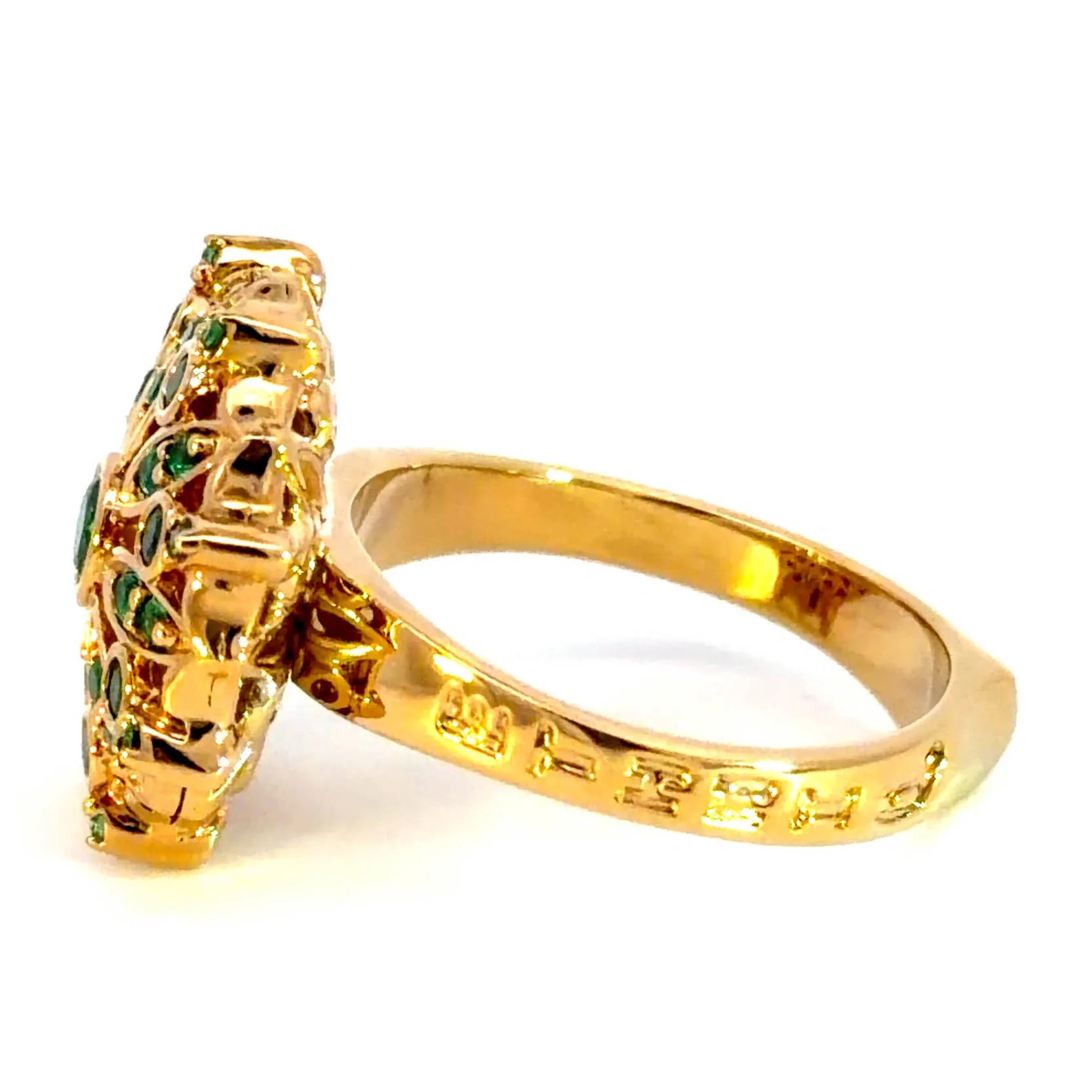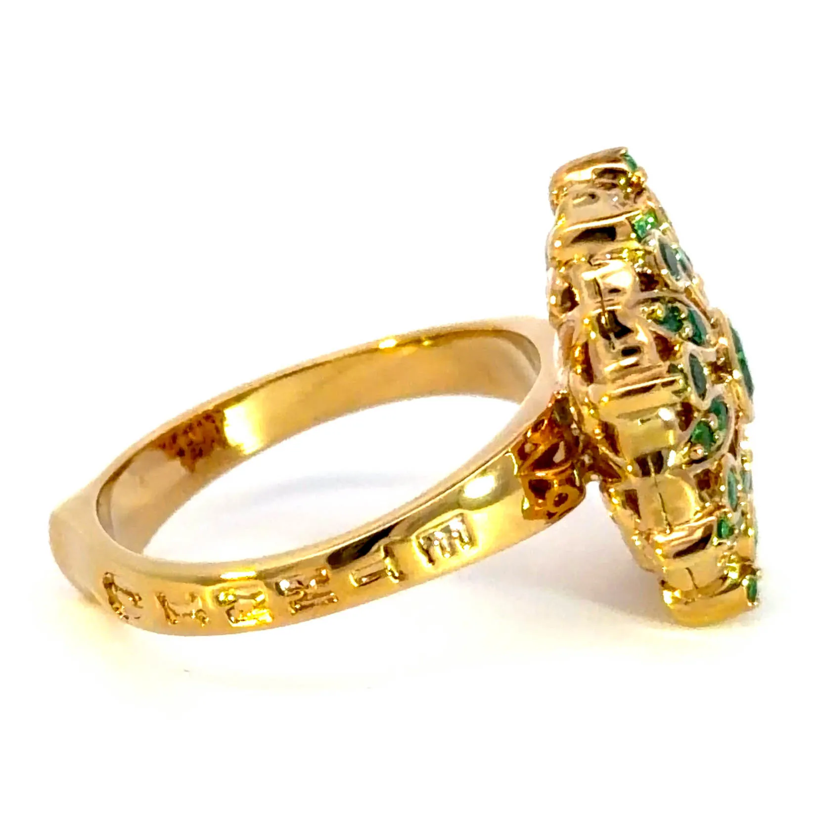 Indulge in the allure of this radiant cocktail ring, masterfully crafted in yellow gold. It showcases a captivating array of round brilliant cut emeralds set in an intricate Motif design. The transparent gems, featuring very slight inclusions, exude a vibrant green hue, bringing timeless elegance to any ensemble.
