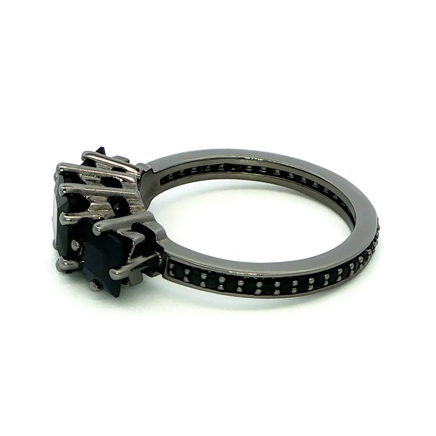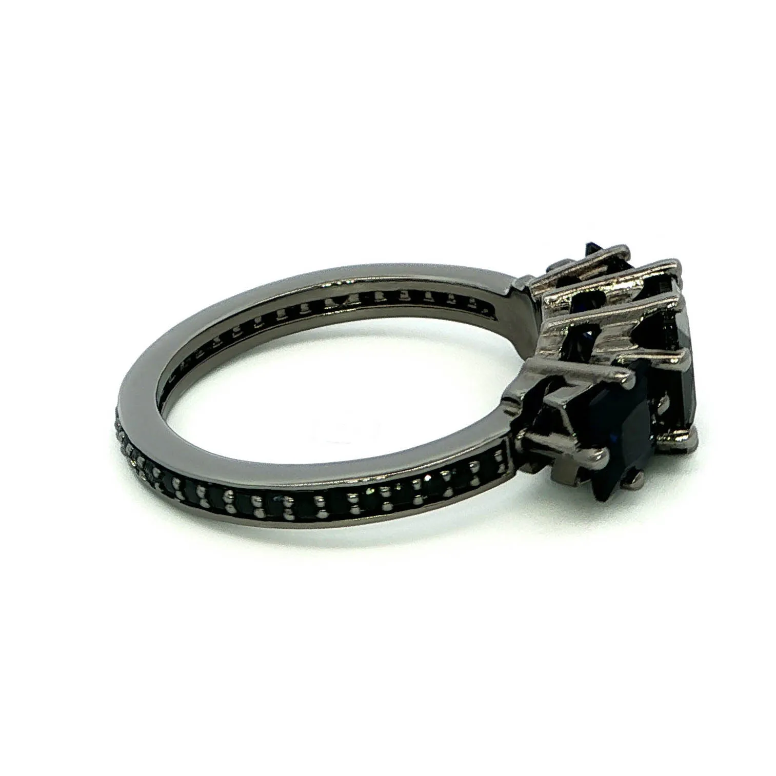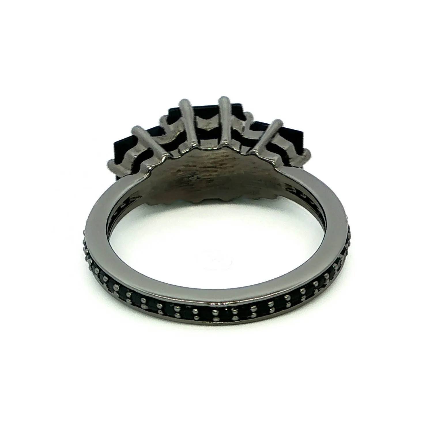 Make a bold statement with this multi-stone ring, featuring a trio of square cabochon-cut onyx gemstones. The sleek, dark metal band complements the deep black hue of the onyx, creating a striking contrast. A unique piece for those who appreciate distinctive design.