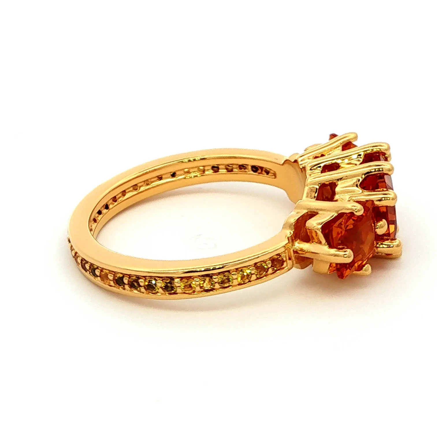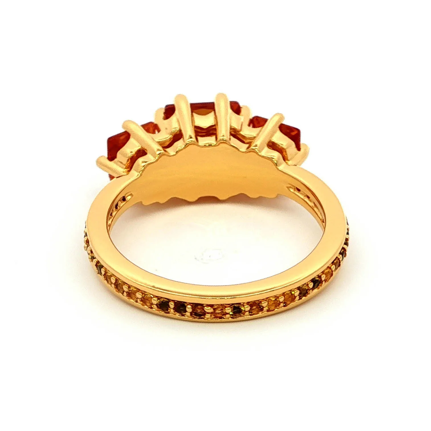 Make a statement with this exquisite multistone ring featuring three captivating square step cut citrines, each radiating a warm orange hue. The citrines are set in a lustrous yellow gold band, enhancing the gemstones’ brilliance and adding a touch of timeless elegance to this beautifully crafted ring.